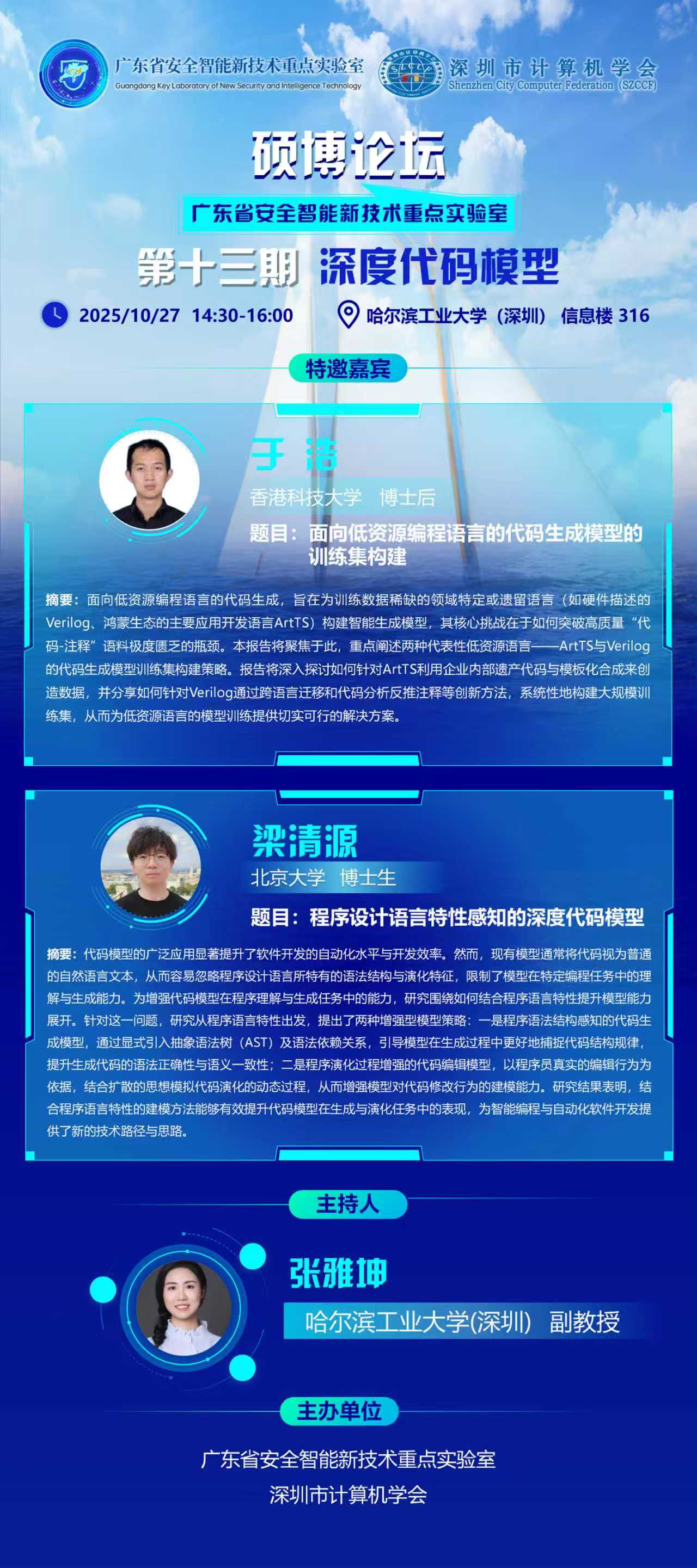 广东省安全智能新技术重点实验室硕博论坛第十三期【深度代码模型】将于2025年10月27日下午14:30-16:00在哈尔滨工业大学(深圳)信息楼L316举办。本期将由香港科技大学博士后于浩、北京大学博士生梁清源对深度代码模型进行分享。