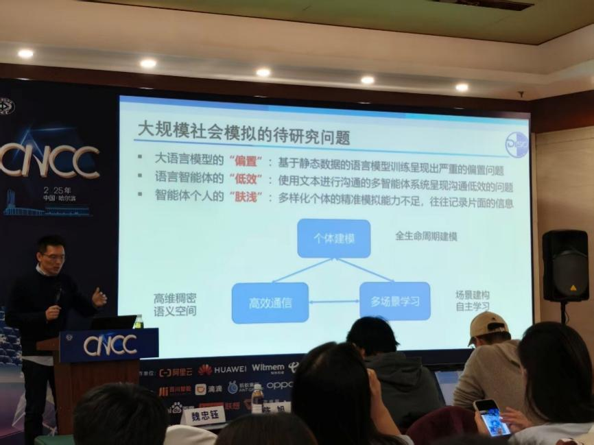 讲座核心环节演示将大模型作为社会智能体的实验,通过信息投放、人群分布、交互规则与演化动力的一致性校准,将大模型智能体与轻量代理混合部署,可在数小时内完成百万级网民的在线社会模拟,实现舆情探索、信息传播分析、政策干预评估等任务。在应用场景中,首先要为智能体进行合理的环境搭建,然后进行个体层面与宏观层面的研究,以及进行外部干预实验。论坛为资源分配、社会契约与公共政策仿真等交叉方向打开了新科研路径。