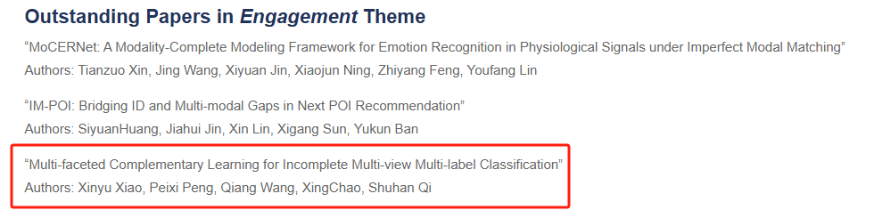 ACM Multimedia 2025于10月27日至10月31日在爱尔兰都柏林召开。哈尔滨工业大学(深圳)计算机应用研究中心漆舒汉课题组博士生肖鑫宇所完成的论文Multi-faceted Complementary Learning for Incomplete Multi-view Multi-label Classification荣获ACM Multimedia 2025杰出论文奖(outstanding Paper Award)。