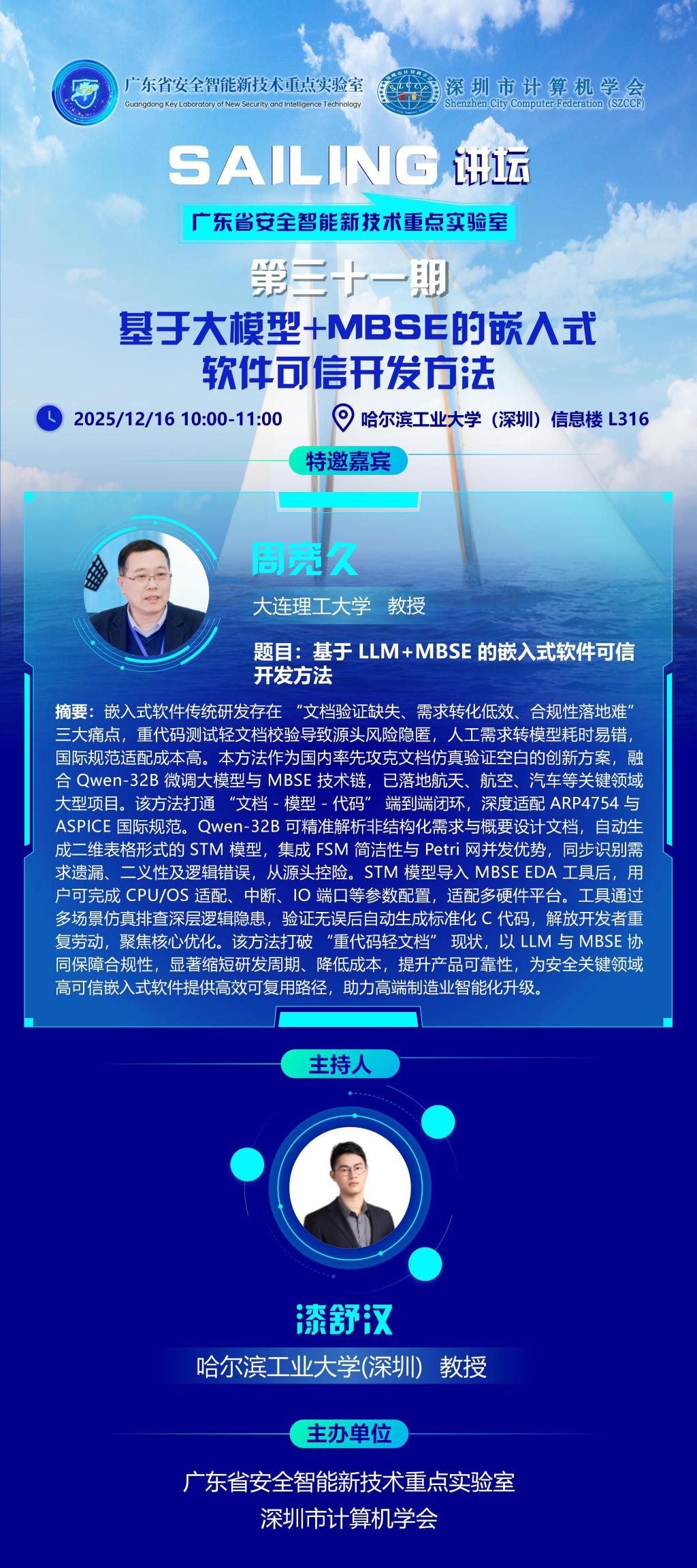 SAILING讲坛第三十一期【基于LLM+MBSE的嵌入式软件可信开发方法】将于2025年12月16日上午10:00-11:00在哈尔滨工业大学(深圳)信息楼L316举办。本期将有特邀嘉宾大连理工大学周宽久教授为我们做前沿的技术分享。